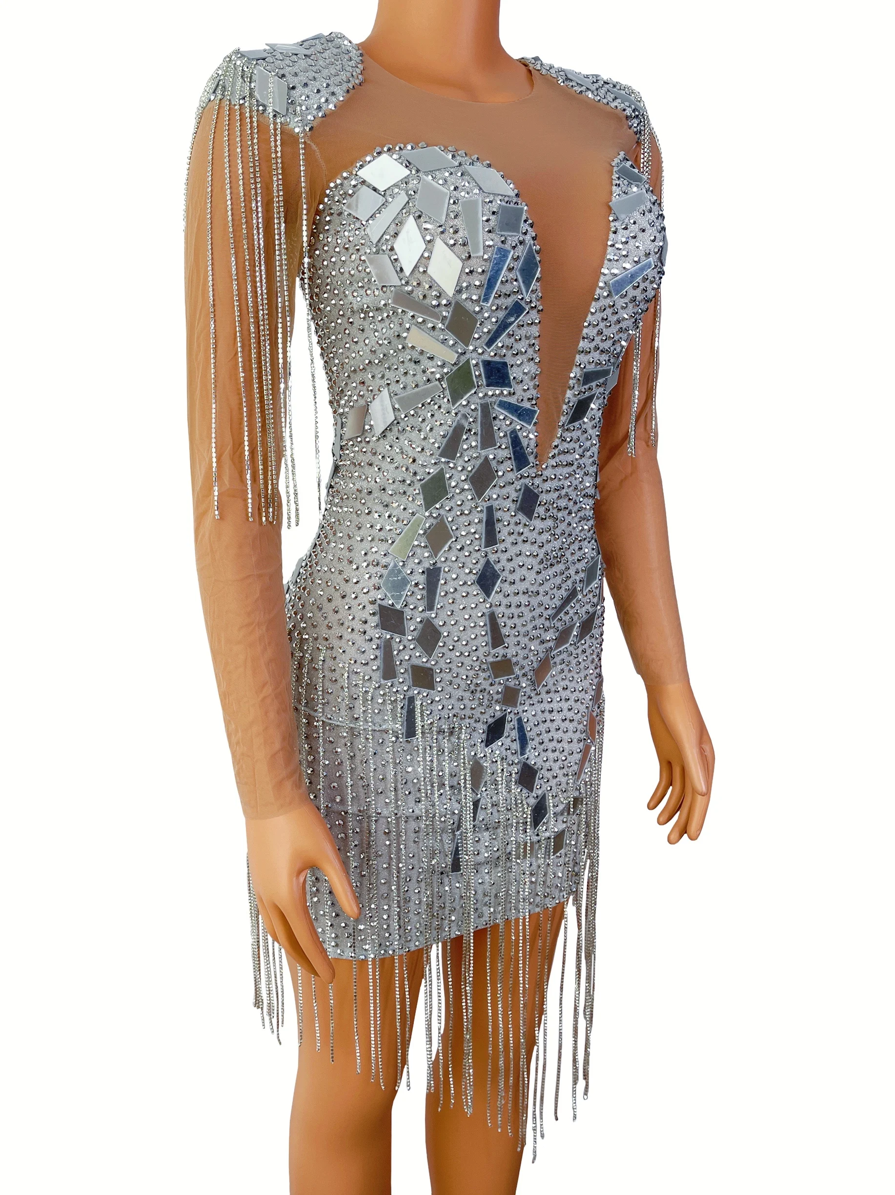 Серебряные зеркала кристаллы цепи сетка платье прозрачный день рождения Празднование бахрома костюм ночного клуба наряд