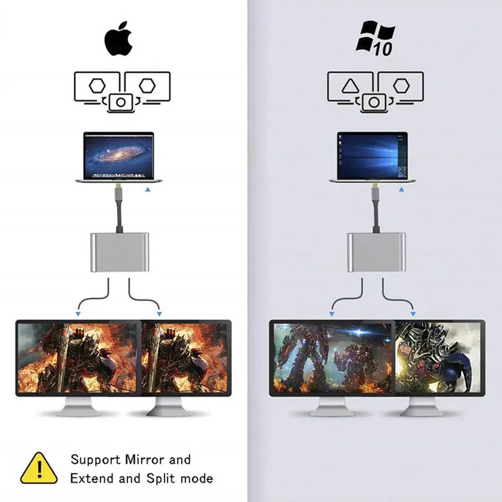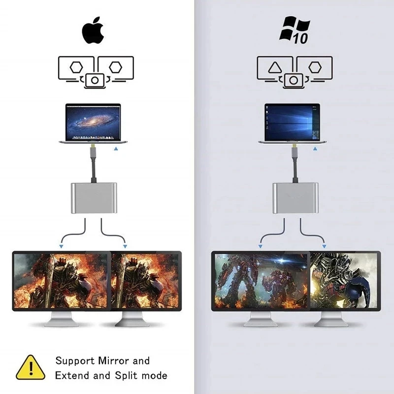 Примечание: Этот адаптер может поддерживать расширенный режим зеркала, расширенный режим только для ноутбука. Для apple computer 2 внешние дисплеи могут отображать только те же изображения, они не поддерживают отображение 2 разных изображений из-за ограничений Mac OS. Расширенный режим поддерживает систему Windows для отображения различных изображений на трех дисплеях