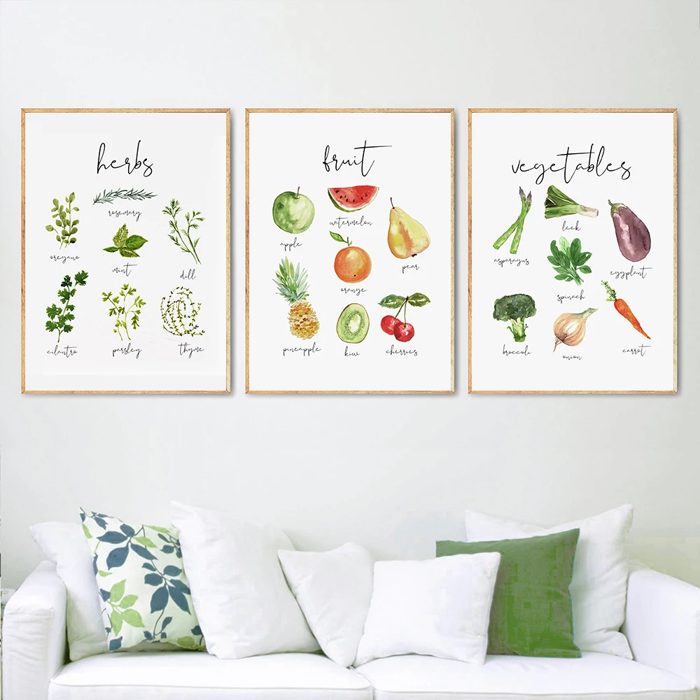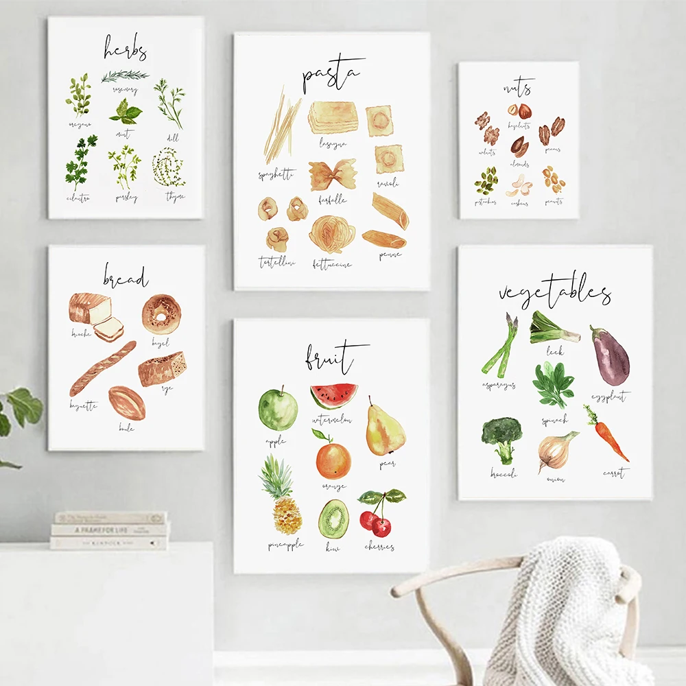 Постер с акварелью, изображением еды, фруктов, овощей, хлеба, сыра, пасты, орехов, Картина на холсте, Настенный декор, украшение для кухни и дома