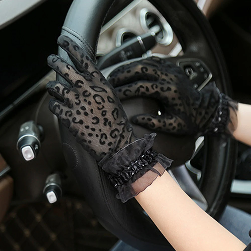 Летние женские кружевные перчатки, привлекательные леопардовые тонкие солнцезащитные УФ-стойкие сетчатые перчатки с закрытыми пальцами для вождения, тонкие тюлевые варежки для вечеринки и свадьбы