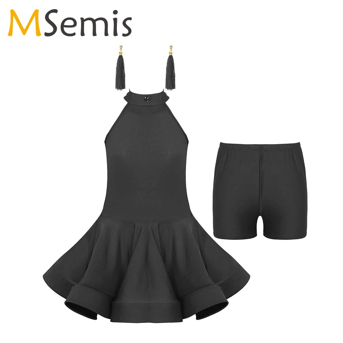 #120-160 дети девушки танцуют комплект одежды без рукавов круглый вырез горловины Стразы Декор, открытая спина, латинские танцы платье с эластичной резинкой на талии трусы-боксеры и серьги с кисточками