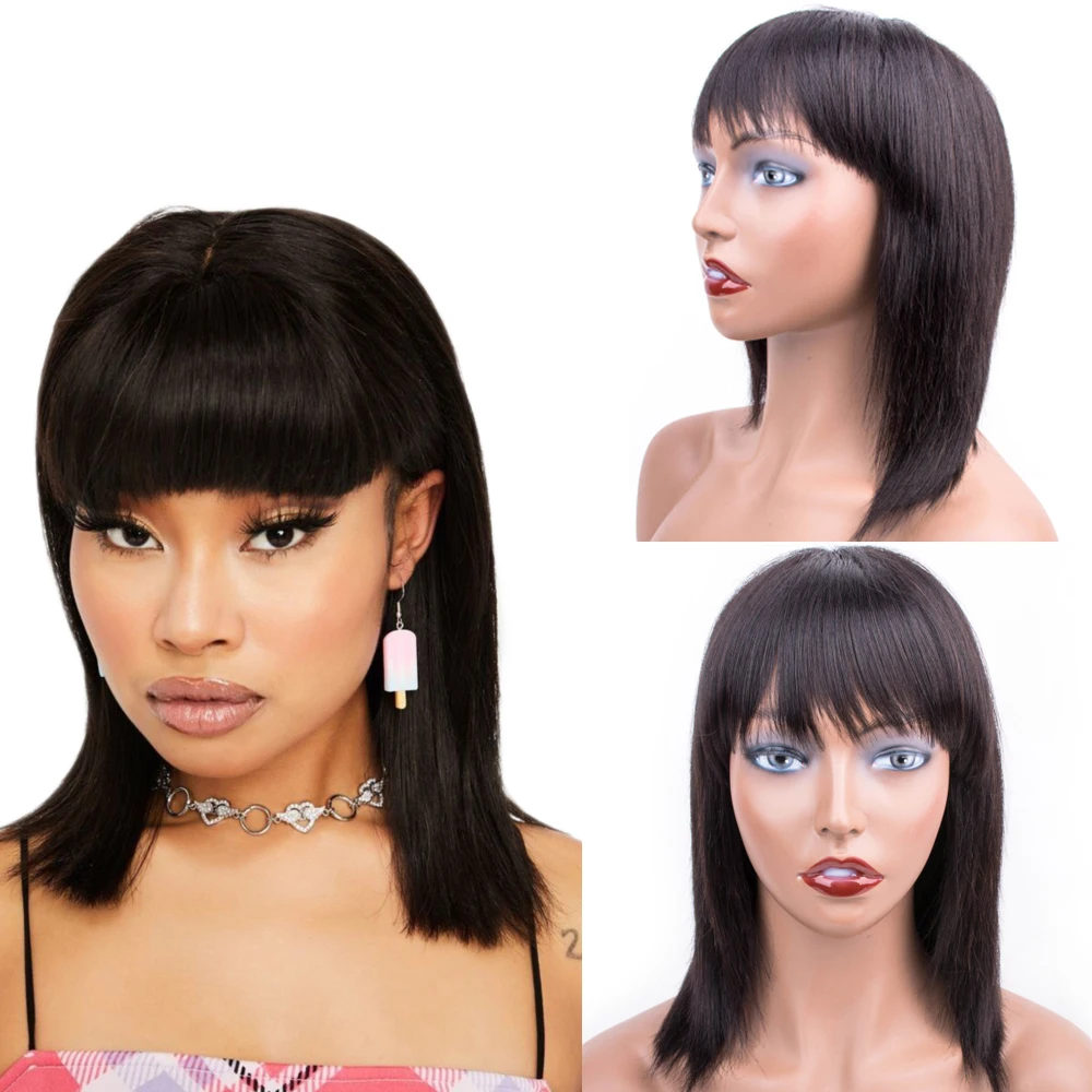 Прямые парики из человеческих волос, с челкой, короткие бразильские...