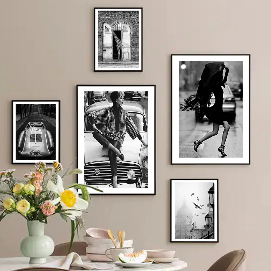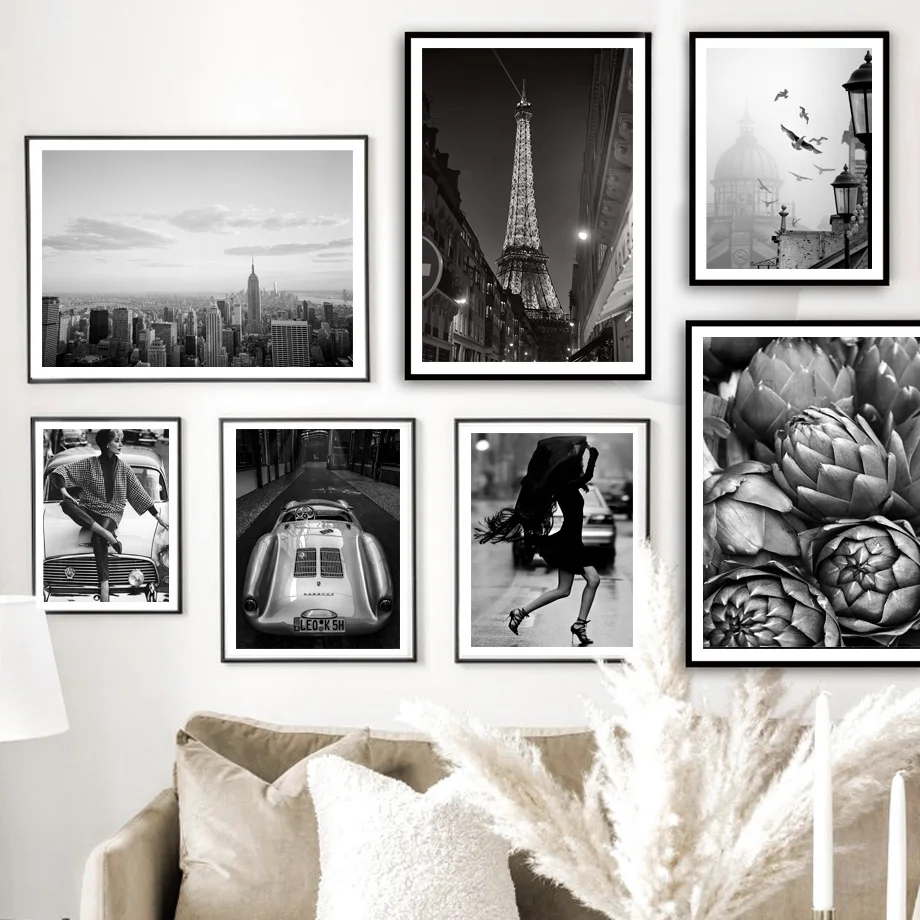 Винтажные настенные картины с изображением Парижа, автомобиля, птицы, лотоса для женщин, черные и белые картины на холсте, постеры и принты в скандинавском стиле для декора гостиной