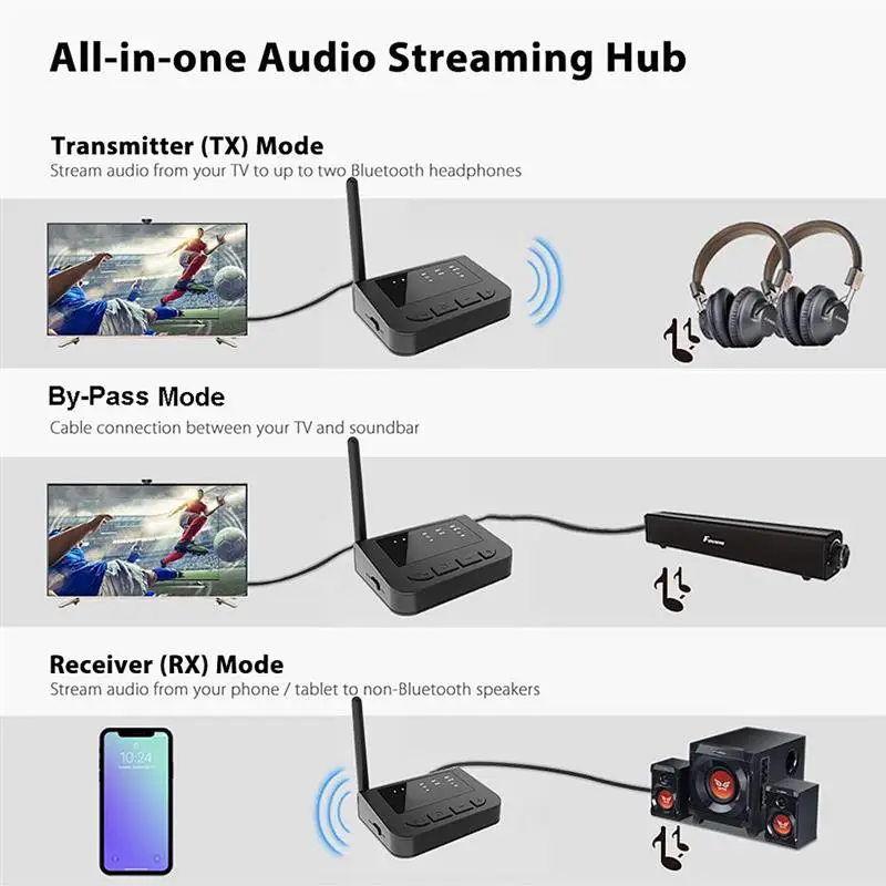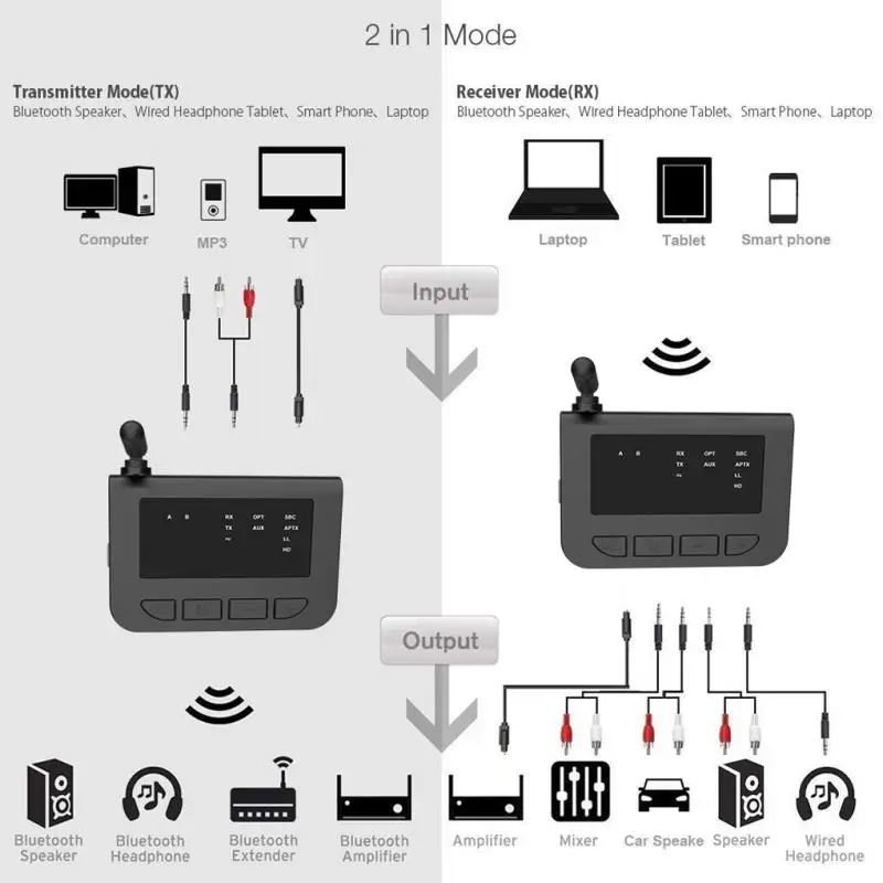 Описание:Беспроводной: Этот передатчик принимает bluetooth-совместимую технологию V5.0, которая обеспечивает хорошую эффективность передачи и стабильное соединение, вы можете наслаждаться музыкой с низкой задержкой, давая вам идеальный опыт прослушивания.3 режима: с данным приемником разработан в 3-в-1 Стиль. В режиме TX Подключите передатчик к устройству аудиовыхода, и вы сможете наслаждаться музыкой через наушники. В режиме RX Подключите домашнюю стереосистему к беспроводному устройству. В режиме байпаса Подключите кабель к телевизору или динамику, легко переключаясь на другие 2 режима.Двойные антенны: рабочее расстояние до 80 м, достаточно для удовлетворения ваших бытовых и офисных потребностей, вы можете заказать без беспокойства. Подходит для телефонов, телевизоров, ТВ-приставок, MP3, динамиков, наушников, компьютера и т. д.Широкое использование: Этот аудиоадаптер поддерживает подключение 3,5 мм, AUX, RCA, цифровое аудио и оптическое волокно, а оборудованный светодиодный индикатор облегчает использование.Многофункциональный: Этот адаптер поддерживает режим TX и Многоточечное соединение RX, вы можете подключить его к 2 bluetooth-совместимым наушникам и колонкам, или подключить к 2 смартфонам одновременно, И это сохранит информацию о сопряжении.Спецификация:Цвет: как на фотографии.Размер: приблизительно 9,5*2,5*6 см/3.74x9.84x2.36inch.Совместимая с Bluetooth версия: V5.0.Совместимый с Bluetooth Файл: RX: A2DP AVRCP TX: A2DPO.Рабочий диапазон: прибл. 80 м/262ft.Входное напряжение/ток: 5 В постоянного тока.Подключение на вход/выход: SPDIF.3,5 мм стерео аудио декодер: aptX HD, aptX низкая задержка, aptX, SBC.Файл поддержки, совместимый с Bluetooth: RX:A2DP AVRCP TX:A2DP.Примечание:В связи с неточной передачей цвета на экране монитора фактический цвет товара может немного отличаться от цвета на изображении.Пожалуйста, учитывайте незначительные отклонения для данных измерений и убедитесь, что вы не возражаете перед заказом.Пакет включает в себя:1 шт. bluetooth-совместимый адаптер (с 1 шт. usb-кабелем, 1 шт. аудиокабель 3,5 мм, 1 шт. 3,5 мм разъем для 2PCA кабеля, 1 шт. цифровой оптоволоконный кабель, 1 Инструкция).
