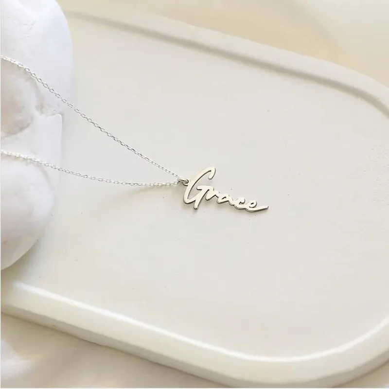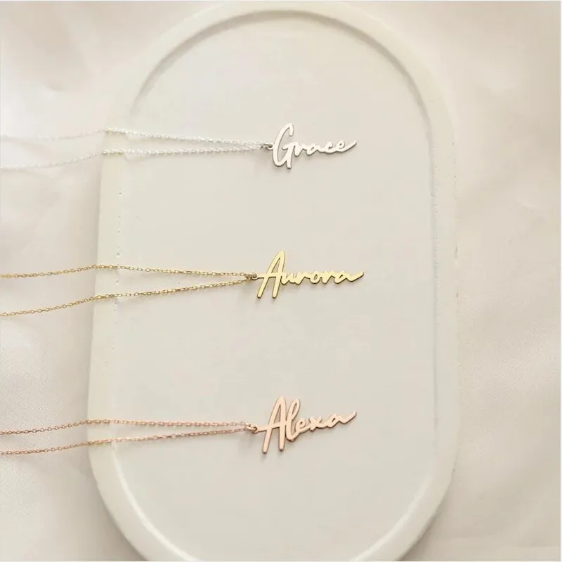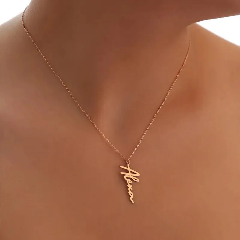 Ручная работа вертикальное имя ожерелье Подпись ожерелье с надписью почерк Шарм табличка из нержавеющей стали ювелирные изделия для женщин