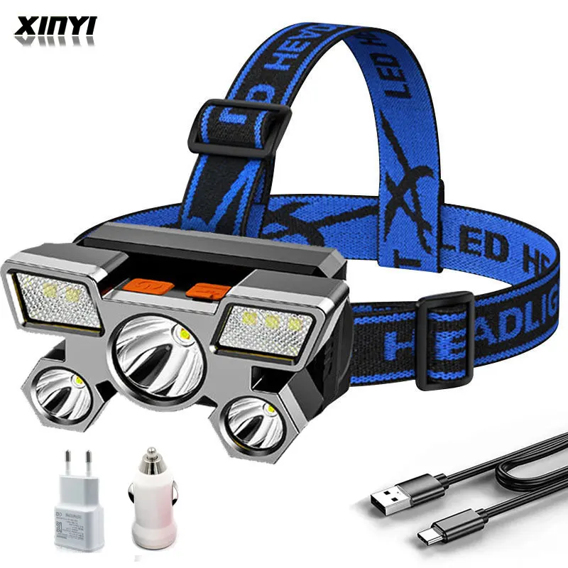 Новый Мощный USB Перезаряжаемый 5 светодиодов со встроенным аккумулятором 18650 портативный светодиодный фонарик Фонарь налобный фонарь для кемпинга