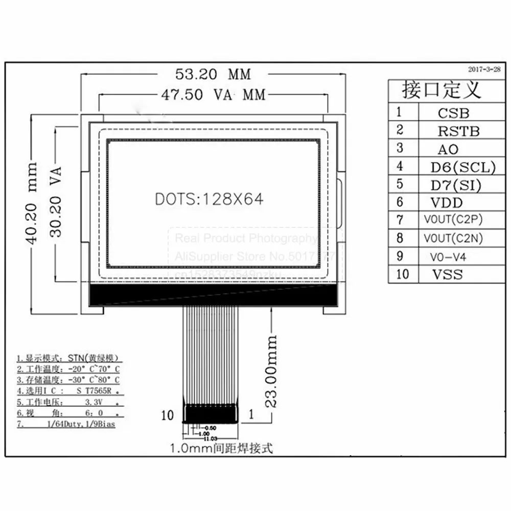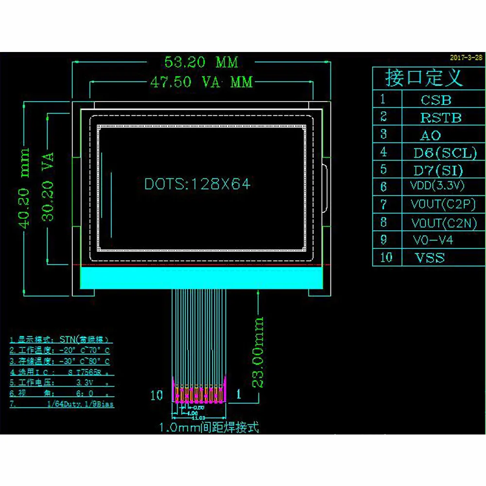ST7565R Драйвер IC 53 мм * 40 мм 10 контактов 1,0 мм Шаг сварки стиль белый светильник черный дисплей 2,4 дюйма 12864 ЖК-экран