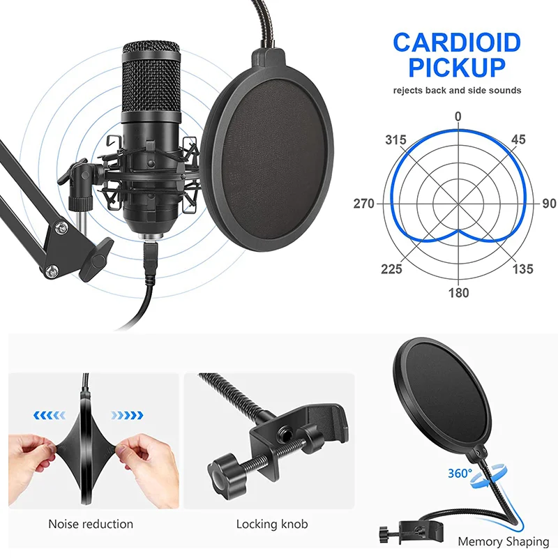 BM-800 кардиоидный микрофон обладает самой чувствительностью спереди и менее чувствителен сзади. Он изолирует от нежелательного окружающего звука и гораздо более устойчив к отзывы, чем всенаправленные микрофоны, хорошо подходит для широкого спектра применений, от вокала до комнатных приложений, до акустических инструментов.