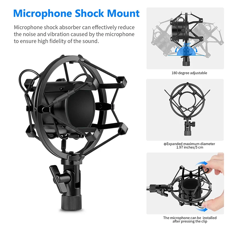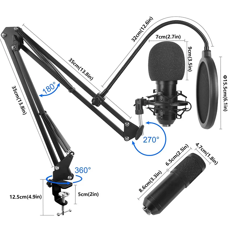 BM-800 микрофон Комплект поставляется в комплекте с тонной необходимые аксессуары, в том числе, конденсаторный микрофон, регулируемый подвесной доводчник-подставка для микрофона, настольный монтажный зажим, поп-фильтр, 3,5 мм мужчина к XLR Женский кабель, звуковая карта/микрофон адаптер и руководство.