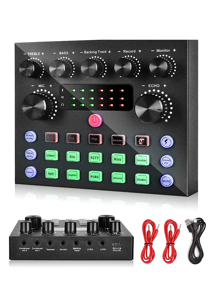 Совместим с ios и android, планшетом, прост в использовании.Профессиональный миксер звуковой карты. С истинным акустическим эффектом, в общей сложности 18 звуковых эффектов, однокнопочный звук поле шума. Представляя фоновую посылка, миксер звуковой карты помогает легко регулировать атмосферу.С функцией возврата. Мобильный аудиомиксер поддерживает мониторинг в реальном времени, а звуки в реальном времени могут эффективно слышать ваш собственный голос, когда вы транслируете и поете в режиме реального времени.Полностью совместим. Мобильная звуковая карта в режиме реального времени совместима с большинством основных программ Kara song, телефонами iOS и Android, планшетами, компьютерами, наушниками, динамиками и микрофонами. Прост в использовании.Долгое время работы. Встроенный литиевый аккумулятор емкостью 1200 мАч может работать непрерывно в течение 6-8 часов после полной зарядки.