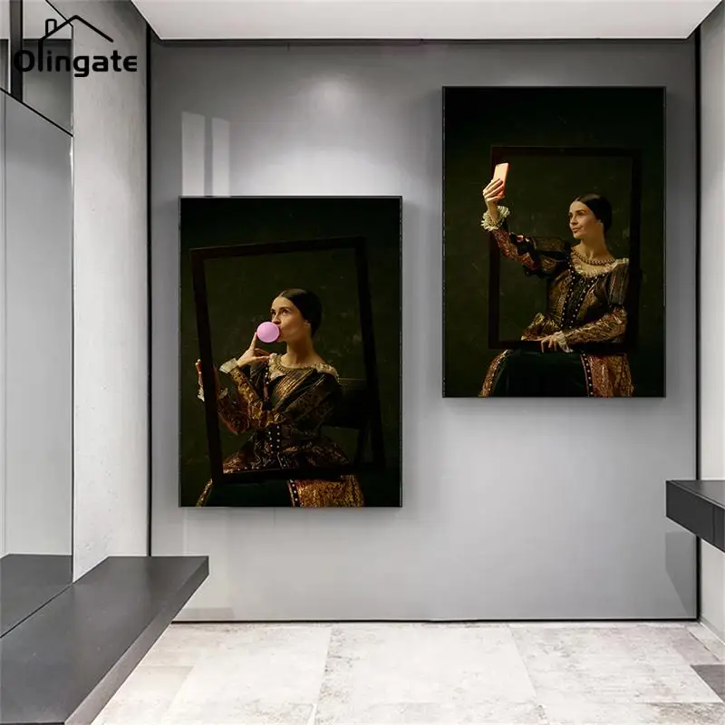 Портретная картина в ретро стиле, винтажная Женская жевательная резинка, Картина на холсте, Женский постер для селфи для гостиной, украшение для дома
