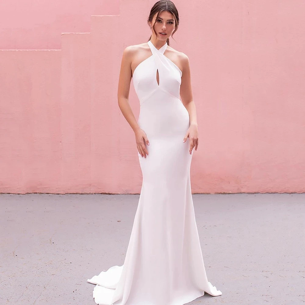 Женское атласное платье с лямкой на шее, белое простое платье в пол с юбкой годе, без рукавов, с открытой спиной, для свадебной вечеринки