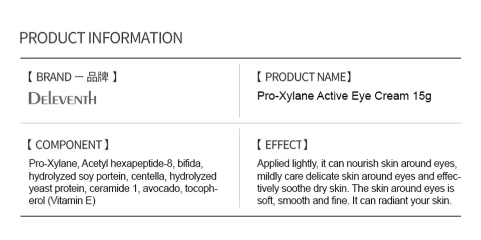● Название продукта: активный крем для глаз Pro-Xylane● Ингредиенты: про-ксилан, ацетил hexapeptide-8, бифида, гидролизованная соя portein, центелла, гидролизованный дрожжевой белок, керамид 1, авокадо, токоферол (витамин е)● Эффект: легко наносится, питает кожу вокруг глаз, мягко ухаживает за нежной кожей вокруг глаз и эффективно успокаивает сухую кожу. Кожа вокруг глаз мягкая, гладкая и тонкая. Он может излучать вашу кожу.