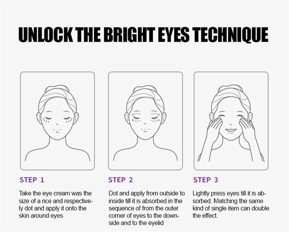 ● Шаг 1: Возьмите крем для глаз размером с рис и соответственно точку и нанесите его на кожу вокруг глаз.● Шаг 2: точка и нанесение снаружи внутрь до тех пор, пока она не будет поглощена в последовательности от внешнего угла глаз до нижней стороны и до век.● Шаг 3: слегка нажмите на глаза, пока не впитывается. Сочетание одного и того же вида товара может привести к двойному эффекту.