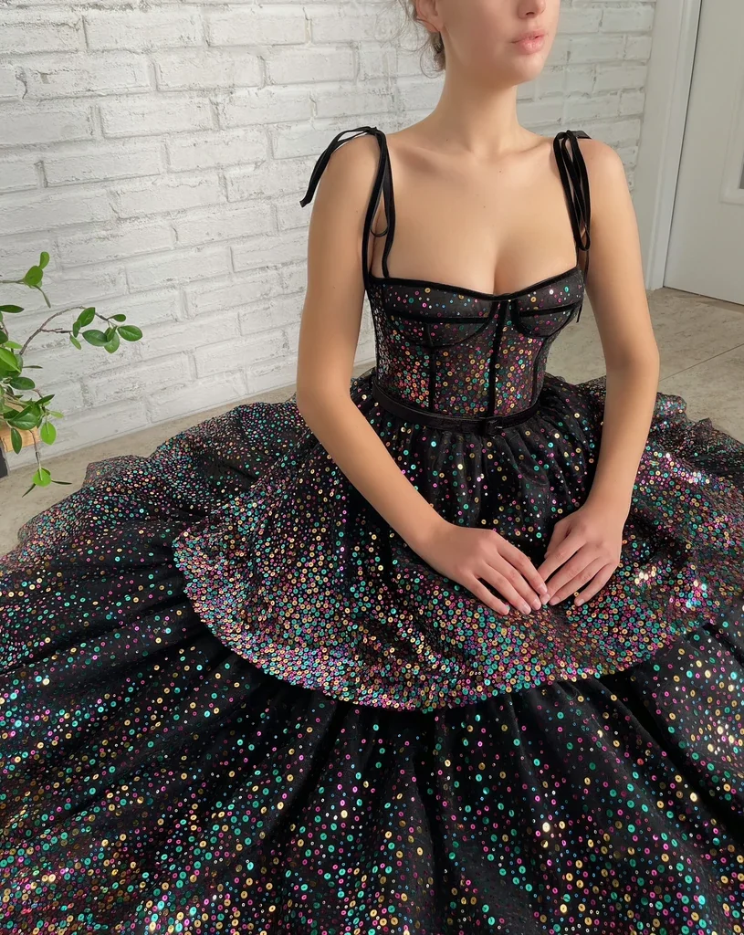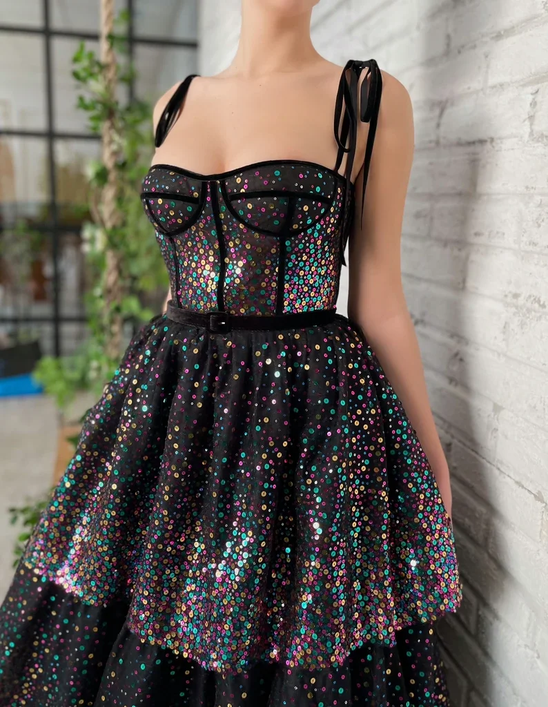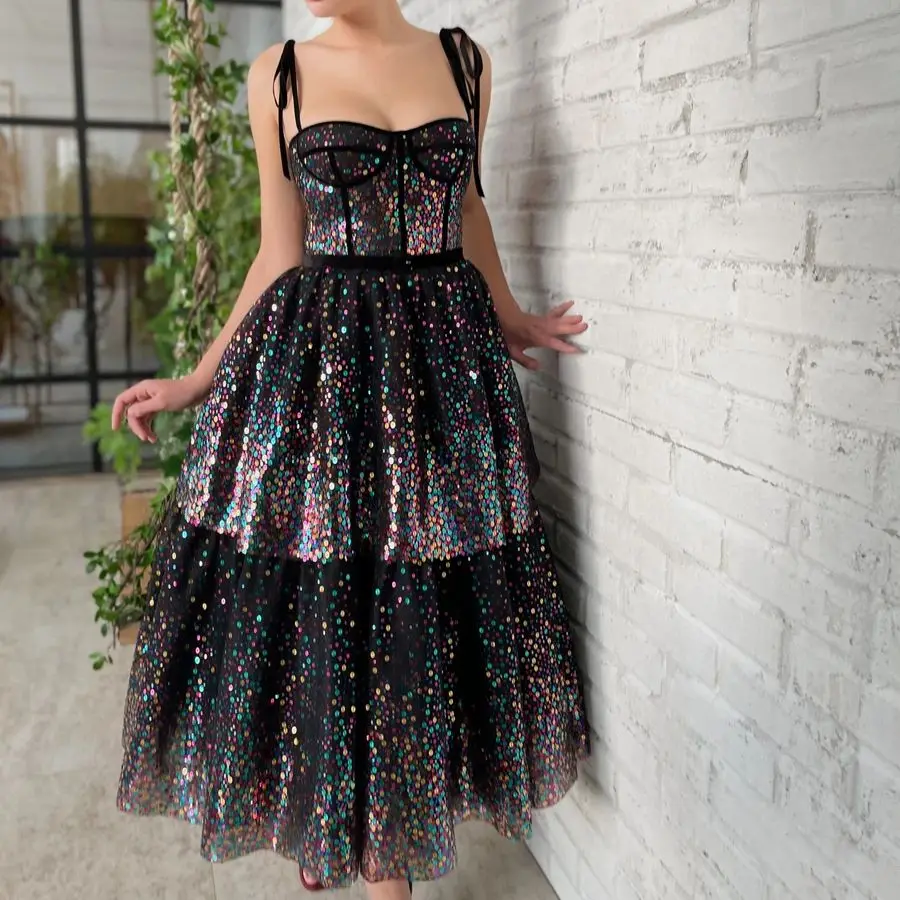 Блестящее цветное черное платье на бретельках, платье миди до щиколотки, многослойвечерние нее платье, коктейльное платье с блестками для женщин, ночные платья