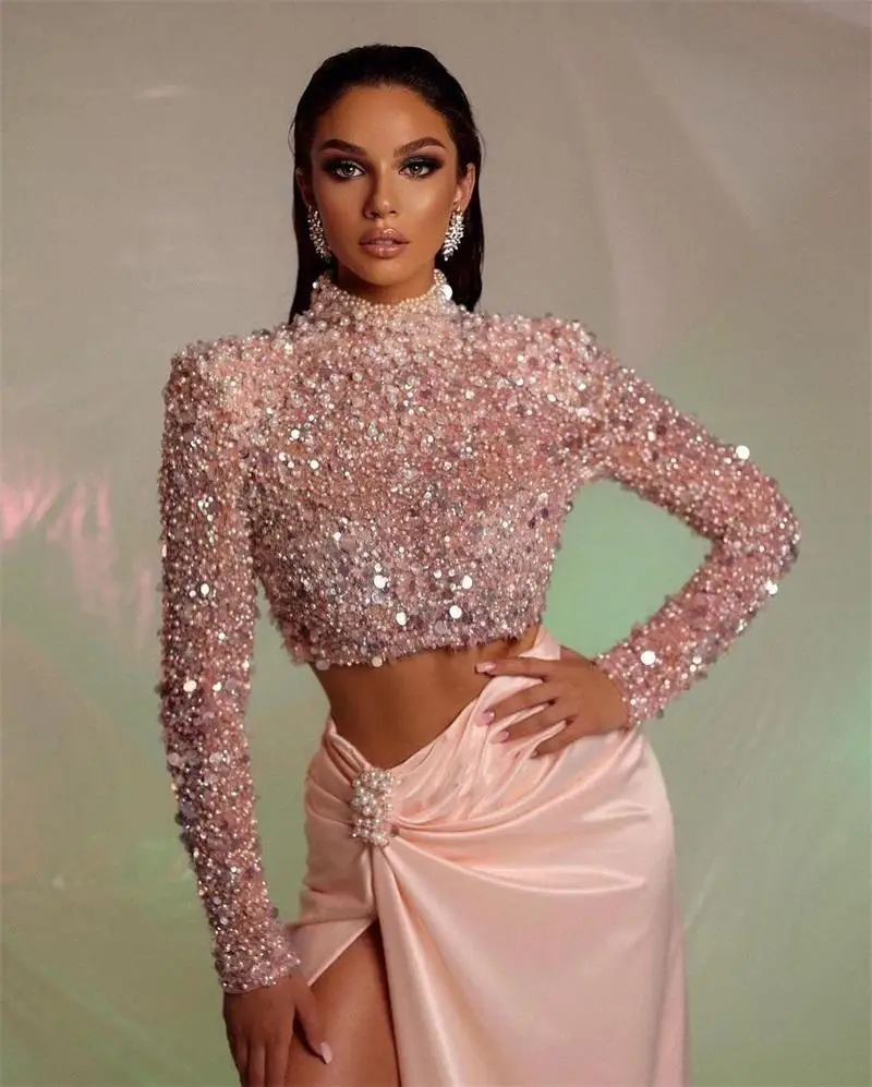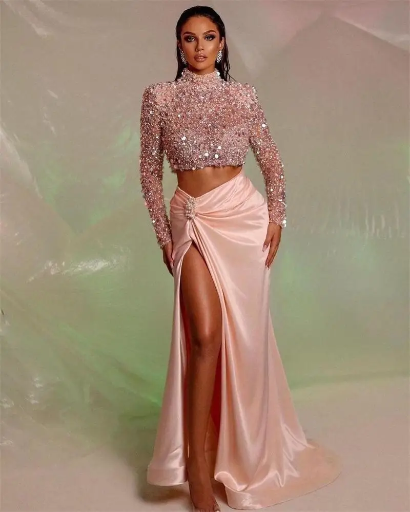2 шт., розовые вечерние платья с бусинами и блестками, выпускное платье с высоким воротником, индивидуальный пошив, сексуальные вечерние платья с Боковым Разрезом и длинным рукавом