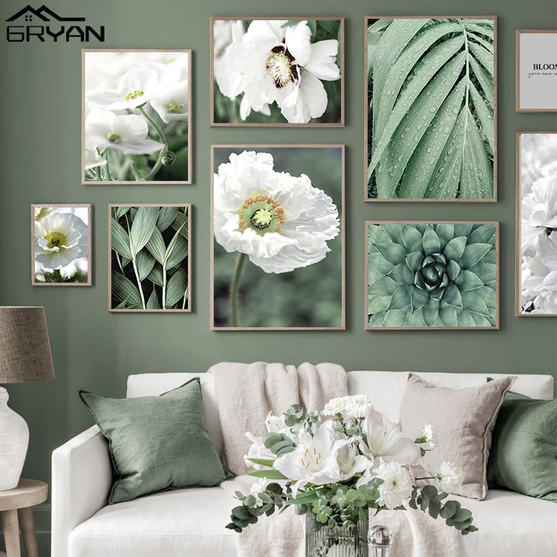 Плакат на холсте с белыми цветами, суккулентами, зелеными листьями