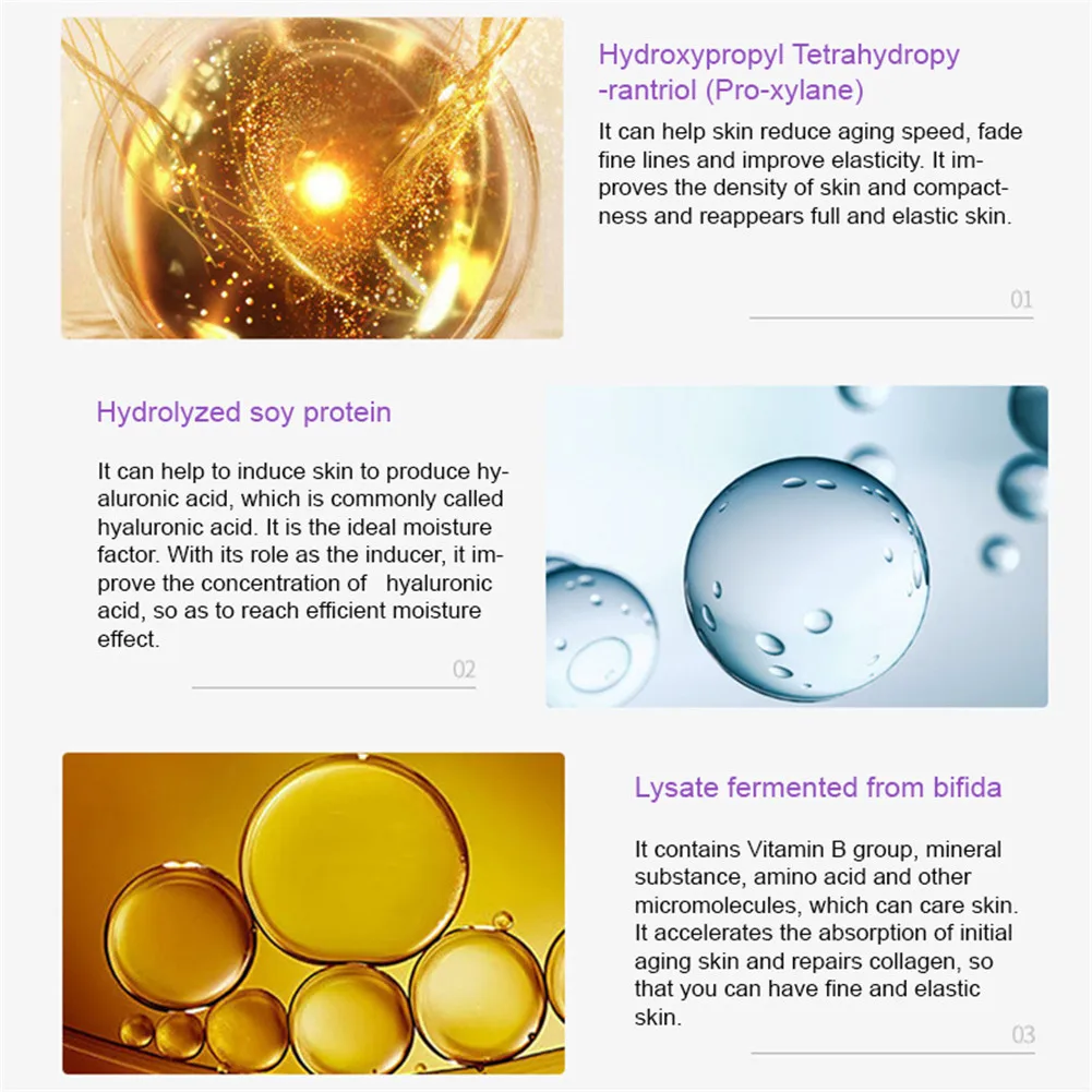 ● Питание и ремонтОн может проникать в дно и восстанавливать кожный барьер● Успокаивающий и питательныйОн может восстанавливать тонкие линии и улучшать эластичность● Улучшает эластичностьОн может ускорить эластичность и придать вам питательную и эластичную кожу● Прочный и прозрачныйОн может облегчить тусклый желтоватый цвет, а кожа будет твердой и яркой.