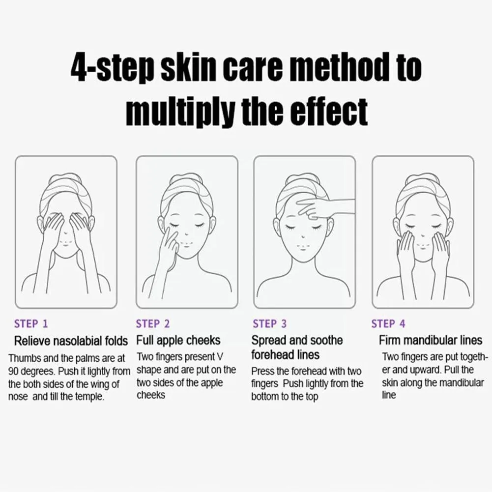 ● Шаг 1: снимает носогубные складкиПальцы и ладони на 90 градусов. Слегка прижмите его с обеих сторон носа и до виска.● Шаг 2: полные яблочные щекиДва пальца имеют v-образную форму и наносят на две стороны яблока.● Шаг 3: разложите и успокаивайте линии лбаНажмите на лоб двумя пальцами, слегка нажмите снизу вверх● Шаг 4: прочные нижние линииДва пальца помещаются вместе и вверх. Вытяните кожу вдоль нижней части