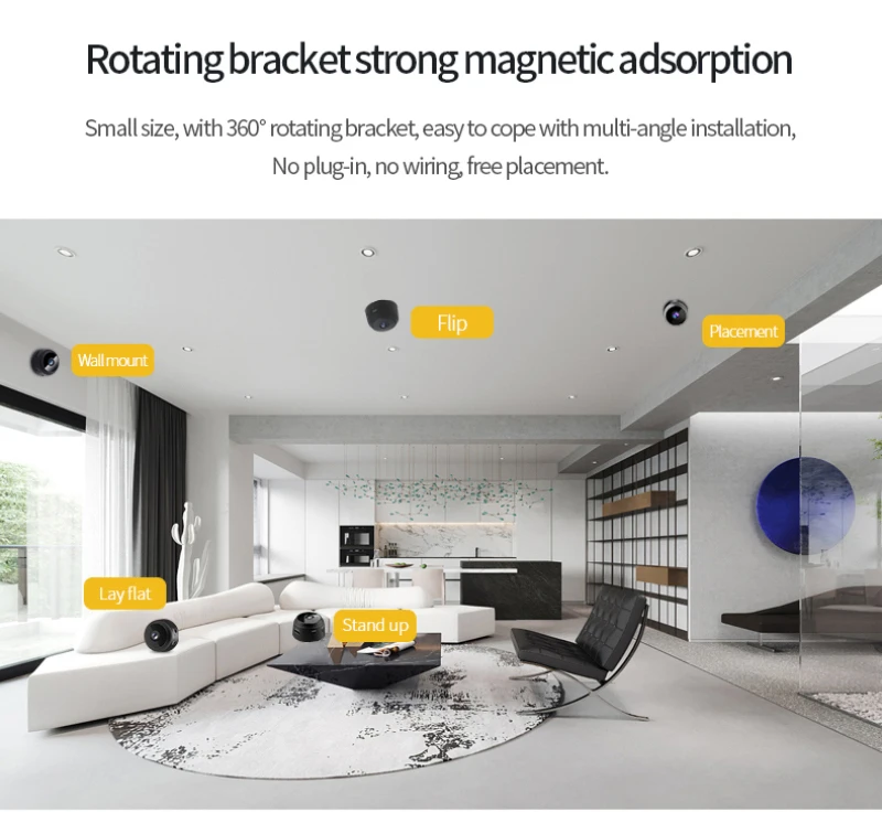 -Эта маленькая ванная комната имеет встроенный Магнит, может хорошо работать с любым железным материалом, легко помещается в любом месте. Эта маленькая камера с жестким зарядным кабелем и базой, при зарядке во время записи вы можете вручную повернуть угол записи на 360 градусов.