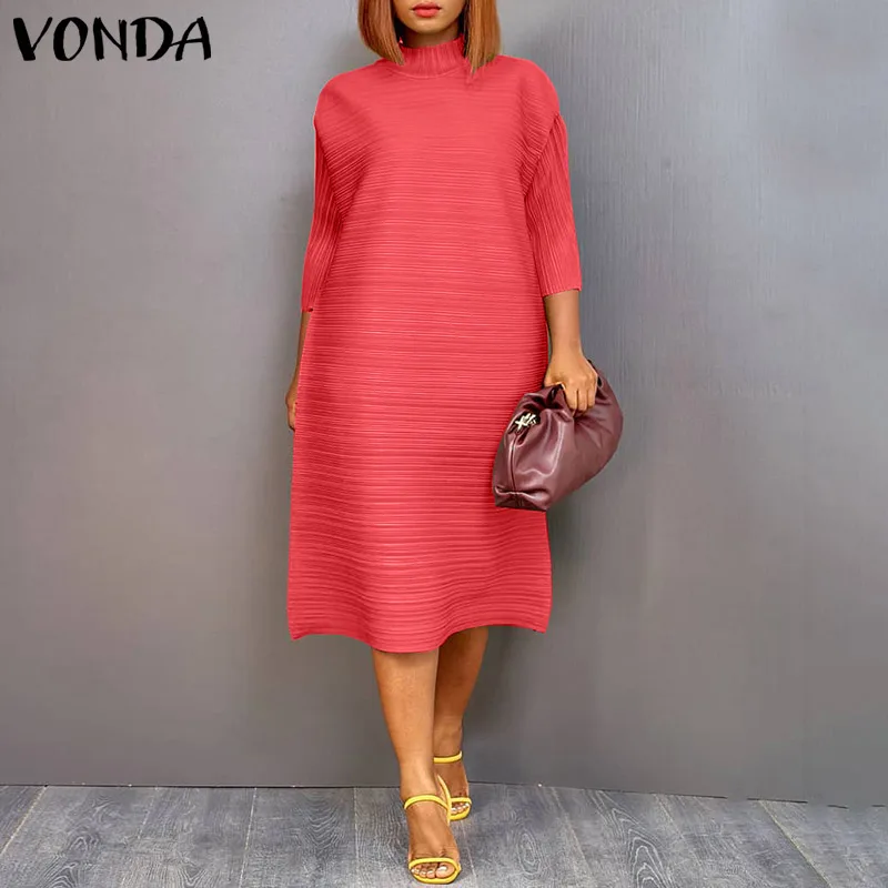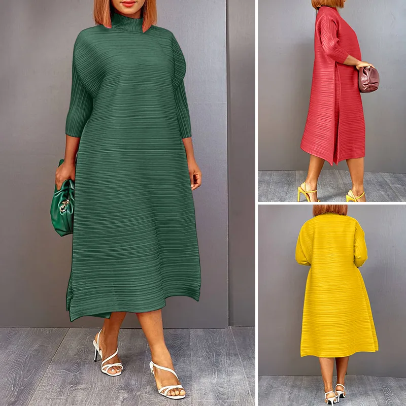 Платье-миди VONDA женское Плиссированное, однотонное, ТРАПЕЦИЕВИДНОЕ, с высоким воротником и Боковым Разрезом, с рукавом 34