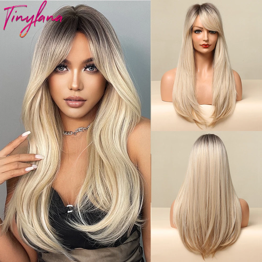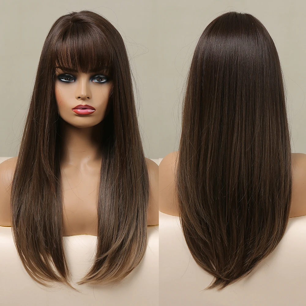 Длинный прямой синтетический парик с челкой для женщин, темно-черный, коричневый цвет, светлый натуральный ежедневный парик для косплея, термостойкий