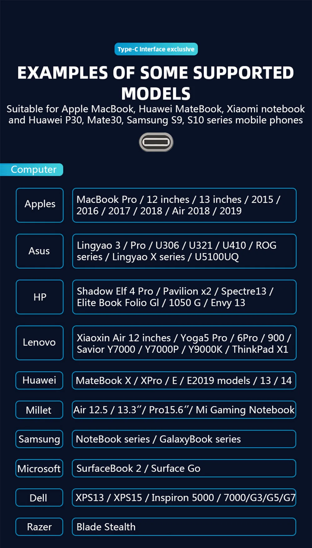 Примечание:Док-станция USB: 4 в 1, 5 в 1,6 в 1,10 в 1Док-станция USB: 13 в 1 Беспроводная зарядка, 14 в 1 двойная HDMI/Беспроводная зарядка, 15 в 1 Беспроводная зарядка