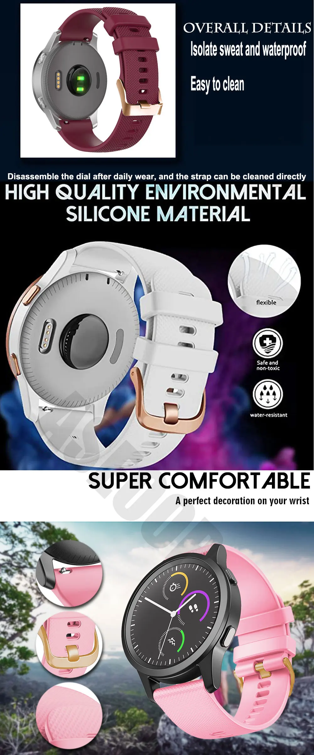 Strap materialThe strap is made of durable and elastic silicone, with a smooth and soft surface