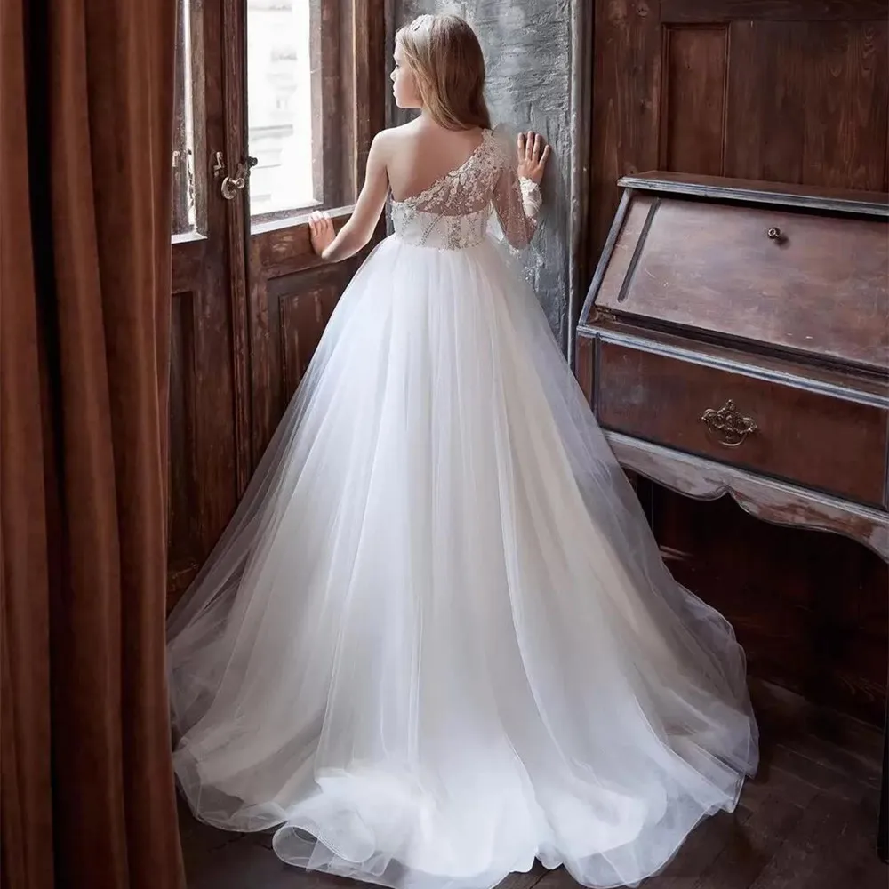 Модные блестящие трапециевидные Платья с цветочным рисунком для девочек на свадьбу с длинными рукавами из бисера для малышей на одно плечо наряды из тюля со шлейфом