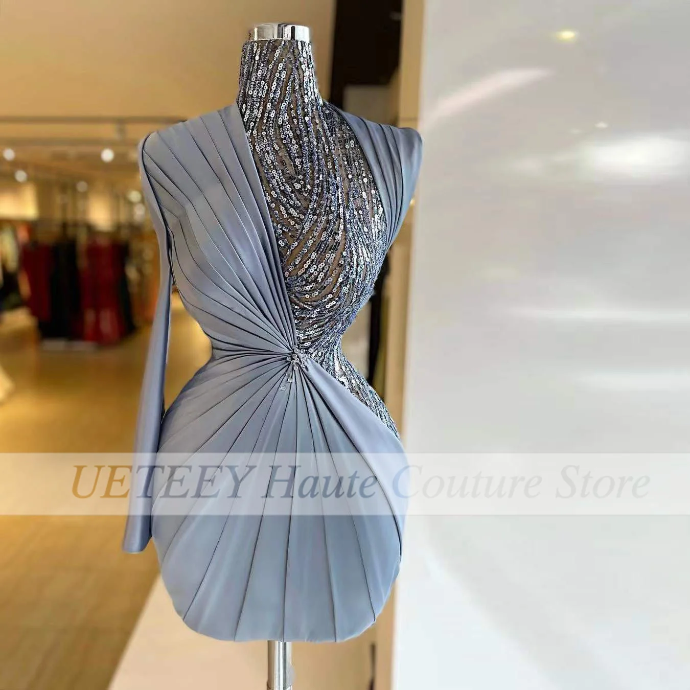 Женское атласное мини-платье, серое плиссированное платье с длинным рукавом и высоким воротом, расшитое бисером, для вечерние