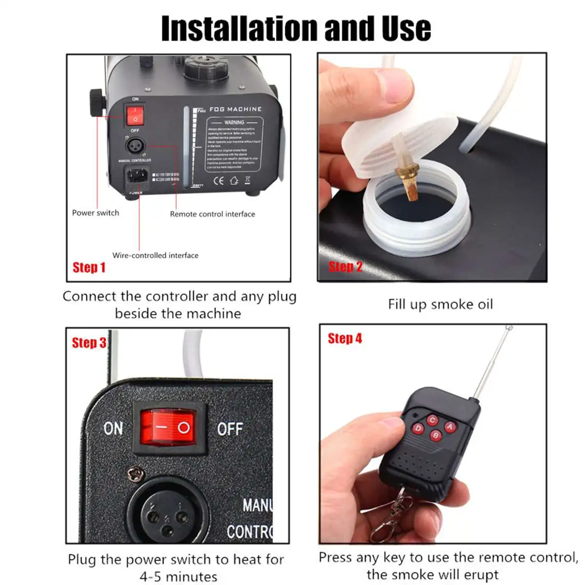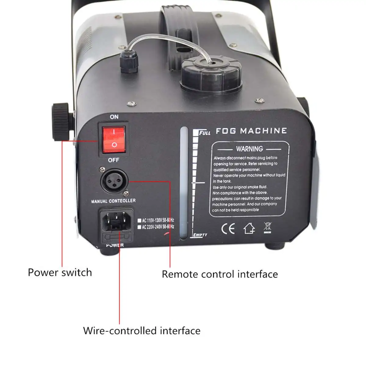 -- Энергосбережение и нетоксичность: Добавьте профессиональную противотуманную жидкость в бак, затем он может производить нетоксичный туман постоянно, нажав красную кнопку на проводной консоли, когда вам нужно.