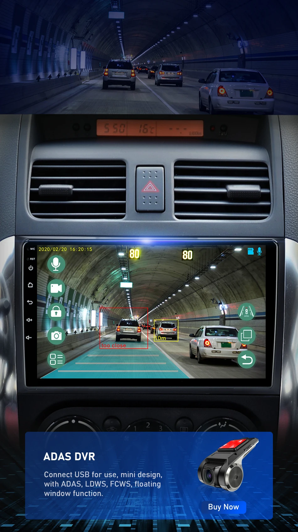 Поддерживает подключение к видеорегистраторУ ADAS. ADAS DVR имеет несколько встроенных ассистивных технологий вождения, вставляя высококачественную карту памяти TF для записи каждого момента вашего вождения.