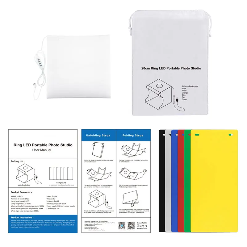 1. Основная студийная коробка (с 1 светодиодный панелью s, 72 светодиодный s в каждой панели) x 12. Мягкая сумка x 13. Черные фоны x 14. Белые фоны x 15. Оранжевый фон x 16. Красные фоны x 17. Синие фоны x 18. Зеленые фоны x 19. 2 в 1 кабель Micro USB x 1