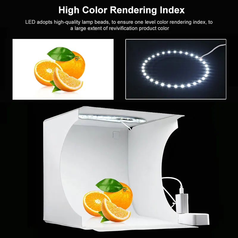 Особенности1. Светильник для фотосъемки предназначен для небольших предметов для любителей фотографии, ремесленников, художников, продавцов etsy и других онлайн-продавцов, профессионалов и клиентов по рекламе продукта.2. Светильник-бокс-студия позволяет быстро и легко снимать мелкие товары, такие как ювелирные изделия, аксессуары, игрушки, часы, гаджеты и другие предметы.3. Соберите свою собственную фотостудию в любом месте в течение нескольких минут, вы можете развернуть этот светодиодный лайтбокс-студия и разместить его на любой поверхности, чтобы получить идеальный фон для фотосъемки небольших предметов, фотографирования продуктов.4. Портативный складной дизайн цепи пряжки, более удобный для установки и переноски, Встроенный светодиодный светильник, обеспечивающий средний Светильник, предотвращает появление теней и отражений на фотографиях.5. С 6 фоновыми подушечками, встроенный светильник и usb-кабель. Три цвета переключатель температуры.Характеристики кольцевого светодиодный1. Количество бусин: 72 шт.2. Модель лампы: 28353. Яркость лампы: 24-26лм4. Белый светильник, цветовая температура: 6500K5. Теплая белая цветовая температура: 3200K6. Мощность: 1-7 Вт7. Напряжение: 5 В8. Указывает: Ra больше 909. Диапазон затемнения: 1%-100%10. Источник питания: порт USB11. Длина кабеля: 2 м