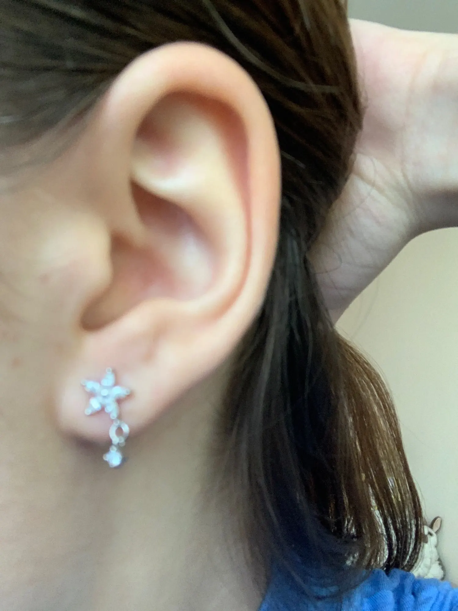 Очень мило, я купил их, чтобы использовать во время рождественского сезона, потому что больше, чем цветы... Я вдохновляю звезды. Я носил их каждый декабрь, не снимая их даже для купания, и они хорошо держались, хотя я чувствую, что камни были немного непрозрачными, и я тоже не уверен, что они полностью серебристые, хотя у них есть печать на базе сережки. Принесите пластиковую и металлическую бабочку... Для комфорта я использую пластик, и вы можете увидеть, насколько я их использовал... Бабочка была желтой;)