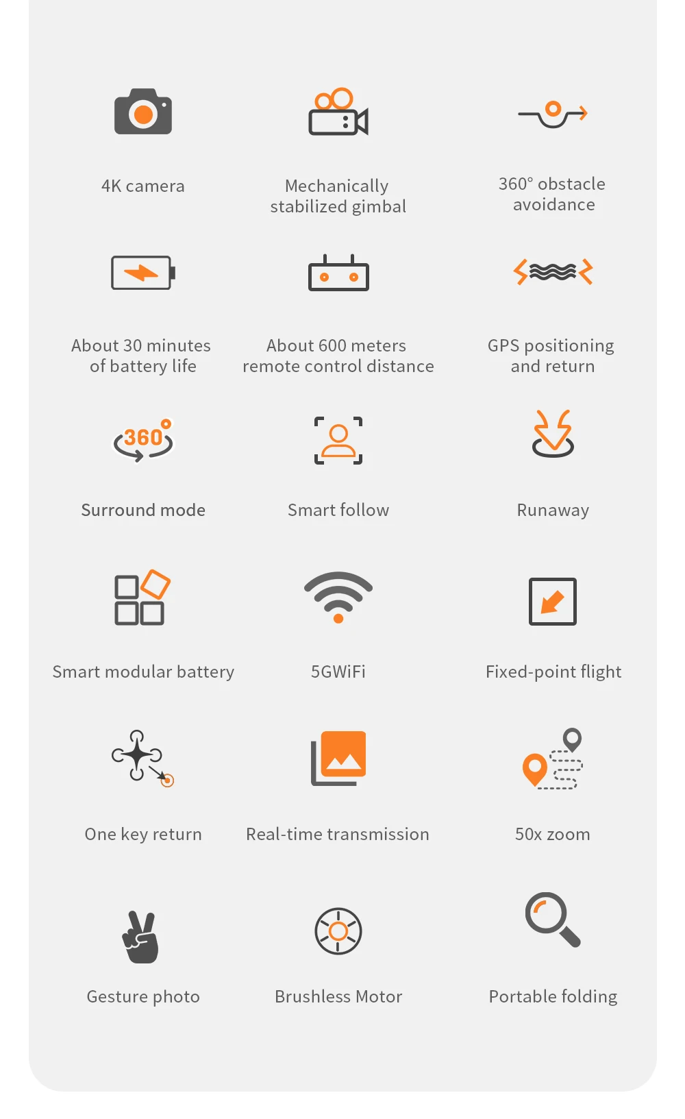 Частота: 2,4GРегулируемый угол камеры: 90 °Аккумулятор дрона: 7,4 в 2200 мАчУправление расстояние (на открытом воздухе): около 1,2 кмРасстояние передачи изображения: около 600 мВремя полета: около 25 минутВремя зарядки: около 180 минутРазмер расширения: 32*30*6,5 смРазмер в сложенном виде: 16*8*6,5 смСумка для хранения Размеры: 27,5*9,5*21,5 смВес с батареей: 330 гОбъектив камеры: 120 °Разрешение видео: 2048*1080PРазрешение фото: 4096*3072PЧастота кадров: 25 кадров в секундуФормат фото: JPEGФормат видео: MP4 или AVIВерсия системы мобильного устройства: iOS 8,0 или более поздняя версия/Android 4.4.4 или более поздняя версия