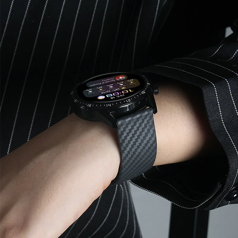 Состав материала:Экологически чистый силиконВес товара:20 гОсновные характеристики продукта:● Дизайн этого продукта эргономичный, удобный в носке, подходит для всех людей.● Изготовлен из высококачественного силиконового материала, мягкий, нетоксичный и безвкусный; Водонепроницаемый и прочный.● Изготовлен из отборного высококачественного силикона, ремешок Круглый, мягкий, красивый и имеет очень хорошую воздухопроницаемость.● Ремешок мягкий и удобный и подходит для запястья.● Ремешок из углеродного волокна высокой четкости без машины.