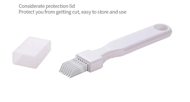 Простота в эксплуатации, быстрая резка. Нажмите и удерживайте сегмент скальона, чтобы заколоть лезвие, и повторно обрежьте его, чтобы создать шелк. Лезвие из нержавеющей стали, высокая твердость, острое лезвие, долговечность и отсутствие ржавчины. С защитой лезвия, чтобы избежать царапин, легко хранить и использовать. 7 лезвий, которые можно измельчить и разрезать на секции. Расстояние между каждым стальным ножом одинаковое, и он может быстро вырезать даже Измельченный зеленый лук и зеленые части лука. Удобный и не скользит. Нескользящая ручка, подходит для формы руки, легко управляется и работает.