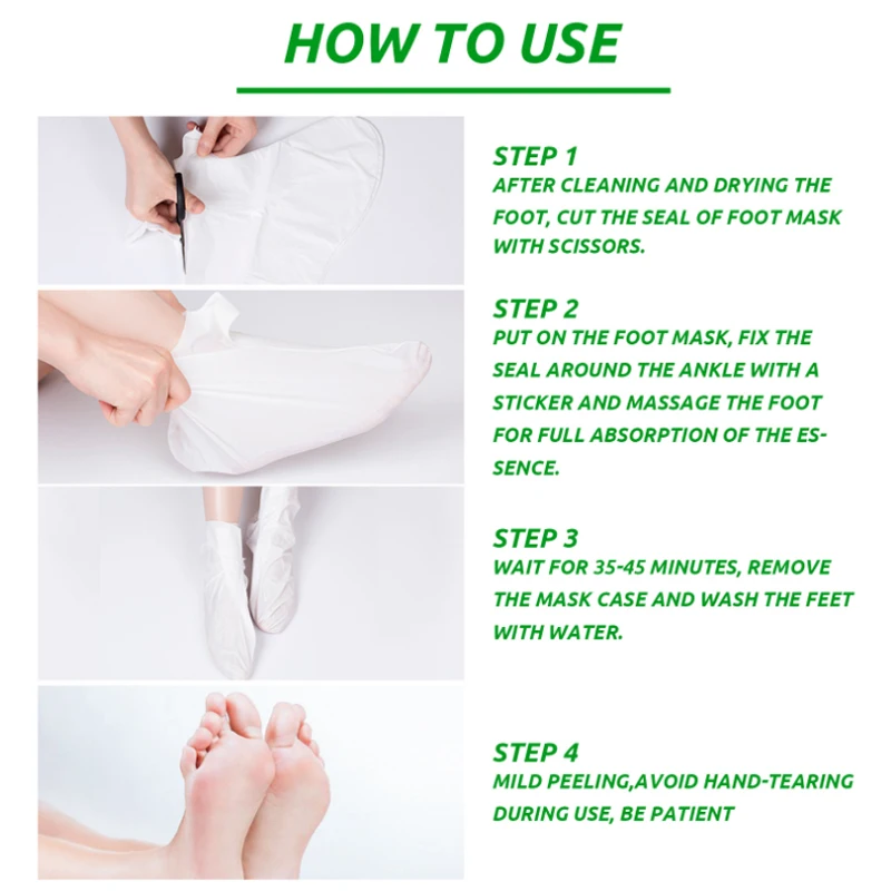 ★Руководство пользователя-правильная инструкция очень важна, будет влиять на эффект маски для ног.1. Вымойте и Замочите ноги горячей водой, а затем высушите ноги.2. Используйте ножницы, чтобы вырезать Уплотнение Маски для ног посылка.3. Носите маску для ног, мы рекомендуем носить пару нормальных носков снаружи, чтобы обеспечить достаточный контакт с эссенцией.4. Снимите маску для ног через 35-95 минут, затем очистите ноги.5. Большинство людей начинают очищать омертвевшую кожу после 48 часов использования, но из-за различных типов кожи кому-то может потребоваться 2-3 пары, пожалуйста, используйте маску для ног снова 48 часов позже.6. Не используйте маску, если у вас есть активный порез или ран.7. Мы предлагаем вам замочить ноги горячей водой после 48 часов использования.★Примечание: после использования около 3-5 дней, старая стопа пустых отходов будет постепенно падать, 5-7 дней в этом процессе. Потому что метаболизм каждого человека отличается, поэтому время выпадения также отличается.