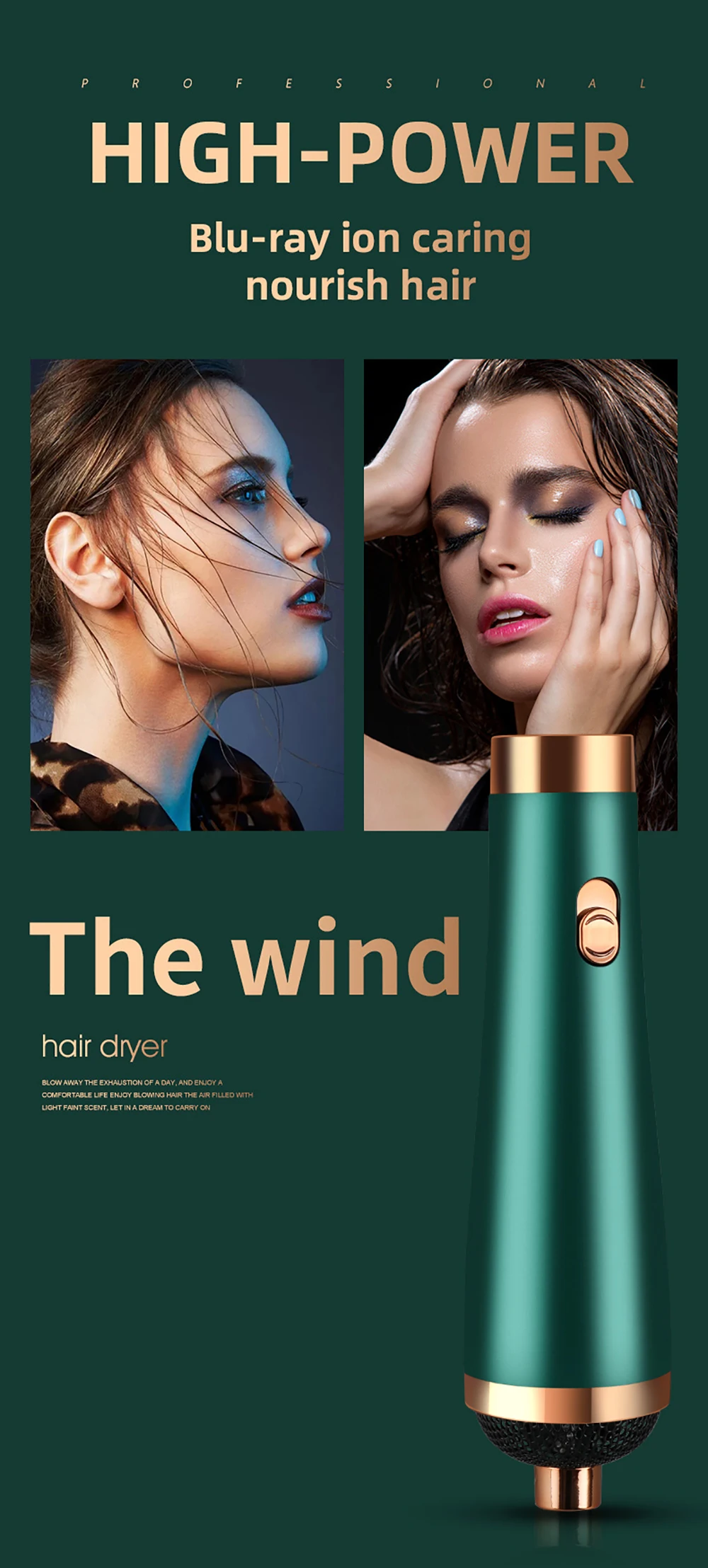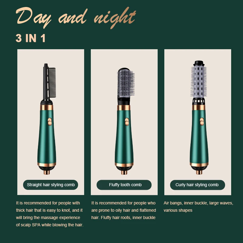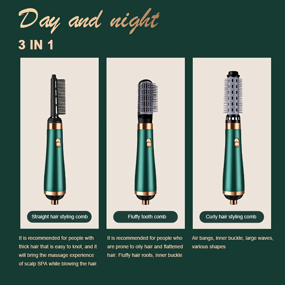 3. Высокоскоростной горячий воздух + Электрический гребень: Высокоскоростной сильный горячий воздух, 170 ° Электрический гребень, подходит для пушистых/прямых волос/удаления масла