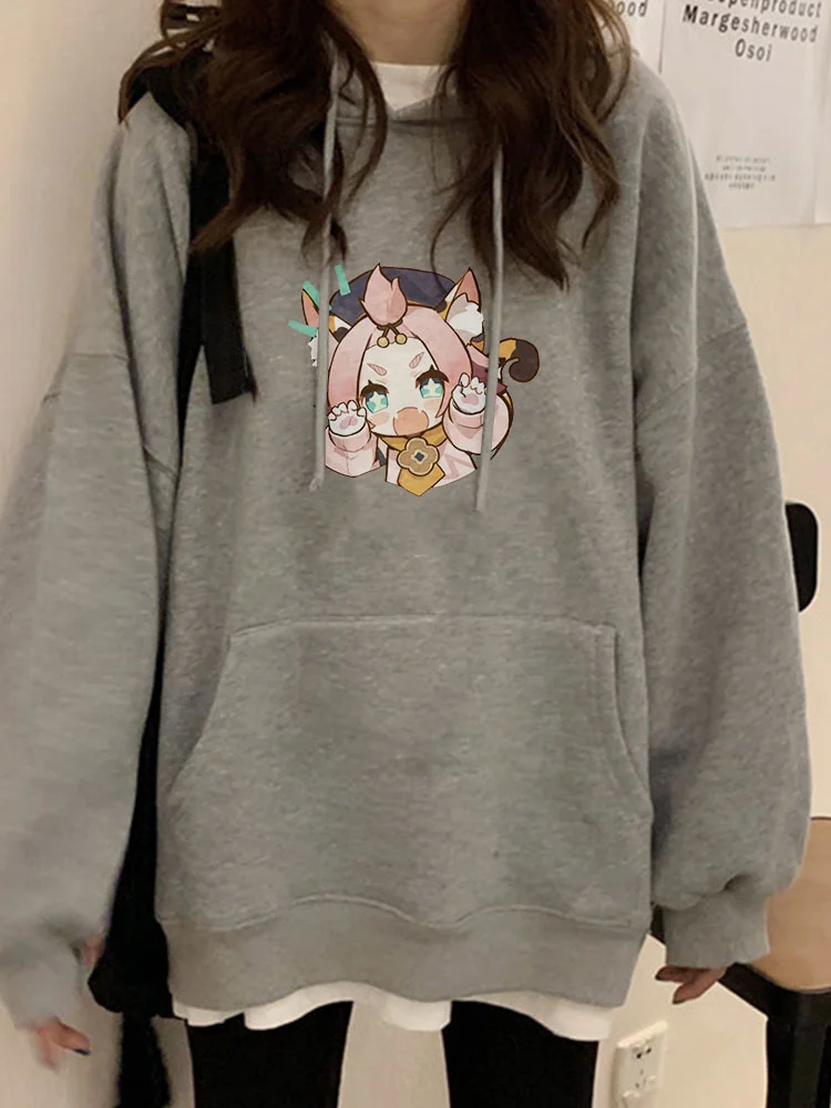 Толстовка с капюшоном в стиле аниме Genshin, популярная одежда с милым принтом из мультфильмов и карманами, новинка весны, Женская Толстовка Оверсайз