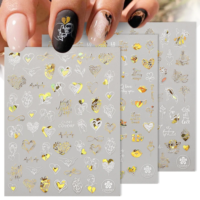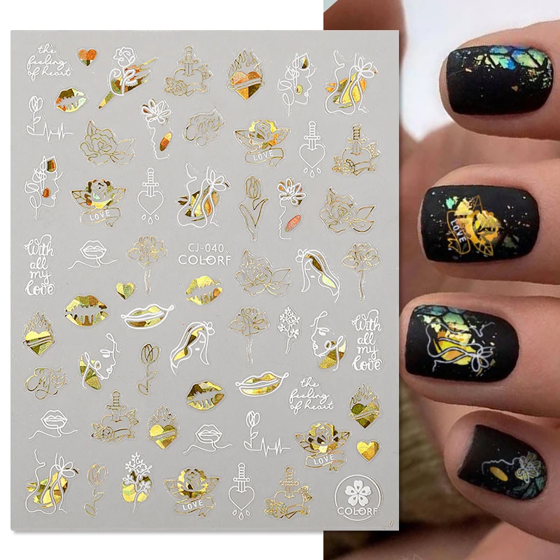 3D наклейки для ногтей, золотой цветок, сердце, любовь, наклейки на День святого Валентина, голографическая абстрактная Женская наклейка для ногтей, слайдер, Декорации для дизайна ногтей