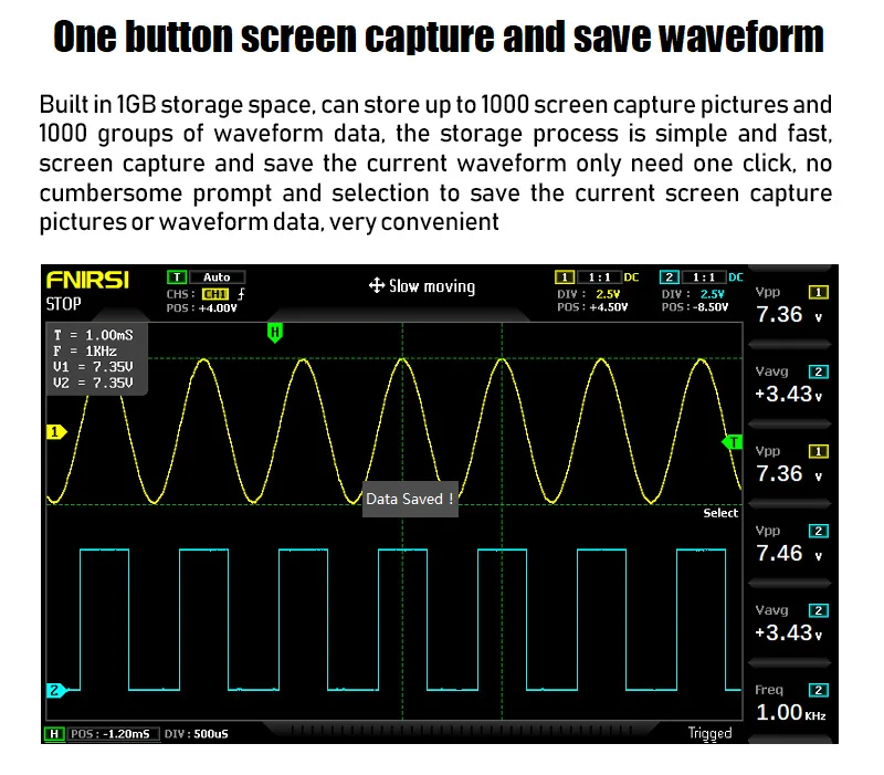 FNIRSI-1014DДва в одном осциллографе и генератор сигналов, в режиме реального времениЧастота дискретизации составляет 1GSa / s и с пропускной способностью 100 МГц * 2 ana-log, с7 дюймов TFT ЖК-дисплей экран дисплея, встроенный высоковольтный pro-tectionМодуль может выдерживать Непрерывное напряжение до 400 В, не беспокоясьО ДТП при сжигании осциллографа, вызванном тем, что датчик не движетсяК 10x зубчатой передаче, встроенный в DDS генератор сигналов и промышленностиOri-ginal chopping output (@ 2.5vpp), все частоты сигнала шаг 1 Гц,Поддержка 14 видов стандартного функционального сигнала и настраиваемая разделкаСигнал, измельчение выходного устройства захватывает часть или всю частьКомплексные сигналы, измеренные осциллографом в качестве выходного сигналаГенератора сигналов, который может хранить до 1000 индивидуальных отключенийСигналы. Приходите и попробуйте, это не подведет вас.Особенности:Встроенный генератор сигналов DDS, поддержка 12 видов функционального сигнала.Функция захвата выходного сигнала, которая может хранить до 1000 сигналов захвата.ЦелевойВысокий интеллектуальный алгоритм декодирования, кодирование бесконечное, иИнтеллектуальная функция защиты от ожогов, 1X выдерживает до 400 ВНапряжение.С пропускной способностью 100 МГц * 2 ana-log и частотой дискретизации @ 1GSa/s (1X = 5 МГц, 10X = 100 МГц).Полностью подходит для 7 дюймов 800*480 цветной TFT ЖК-дисплей с яркими цветами и высокой контрастностью.Диапазон высокого измерения напряжения: 1X может измерять 0 ~ 40 В, 10X может измерять 0 ~ 400 В.До 12 параметров измерения: VPP,VP,Vmax,Vmin,Vavg,Vrms, частые, Duty +,Duty-,Time +,Time-,Period.Функция измерения курсора: удобно вручную измерять период, частоту и напряжение.Полная функция запуска (одиночная, нормальная, автоматическая), и в любое время дисплей формы волны (Функция паузы) заморожен.Оснащен высокой эффективностью одной кнопкой авто, и одной кнопкой хранения сигнала и функции скриншота.Встроенная память объемом 1 ГБ позволяет хранить до 1000 скриншотов + 1000 наборов данных волноводной формы.МощныйМенеджер изображений waveform поддерживает просмотр эскизов, просмотр, детальныйПросмотр, поворот страницы, удаление и масштабирование формы волны, масштабирование,Перемещение и т. Д.Оснащен интерфейсом USB, который может быть подключен кCom-puter, чтобы поделиться своими скриншотами с com-puter, который являетсяУдобно для вторичного анализа.Графический дисплей с рисункамиФункция может использоваться для определения амплитуды, частоты и фазыКонтраст двух групп сигналов.Функция отображения FFT, может анализироватьСпектральные характеристики сигнала, сжатие памятиТехнология, экран обновления формы волны не мерцает.С функцией регулировки яркости экрана и функцией регулировки яркости фона gr-id, также легко носить с собой.Характеристики:Материал: АБС-пластикAna-log ширина ремешка: 100 МГц * 2Количество каналов: 2 каналаМаксимальная частота дискретизации в реальном времени: 1GSa/sВертикальная чувствительность: 50 мВ/див ~ 500 В/ДивГоризонтальный диапазон времени: 50S/div ~ 10NS/divМаксимальное тестовое напряжение: 40 В (1X зонд), 400 В (10X зонд)Глубина хранения: 240 кбитВходное сопротивление: 1MΩТочность ADC: 8 битРежим соединения: AC/DCРежим запуска: одиночный, нормальный, автоматическийКромка триггера: поднимающаяся кромка/опускающаяся кромкаВнешний триггер напряжения 0 ~ 40 вУдлинительные порты: экспорт изображений USBРазмер посылка: 340*140*70 мм/13