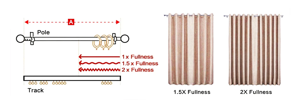 2. Длина штор = B/C (до высоты от полюса/дорожки до нижней части B/C ). E. g. A = 200 см, C = 250 см, размер штор должен быть 2x200x250 см или 2x150x250см.