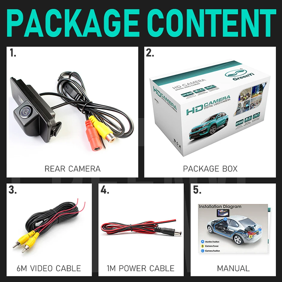 Особенности:* Использование цифрового датчика траектории изображения CCD предназначено для разработки дизайна автомобильного заднего вида с использованием технологии цифровой заливки и программного обеспечения, четкого изображения в дневное время и ниже в ночное время.* От-35 до + 60 температурный диапазон применения, полностью соответствует применению автомобильной среды.* Фабрика после испытания на погружение в воду высокого давления и 12 часов на электрическое испытание на старение, многослойный водонепроницаемый дизайн, действительно высокое давление стирки и погружения* 6 м видео кабель подключения монитора, кабель питания подключения автомобиля задний светильник питания, Реверсивный, реверсивная система мониторинга автоматически начинает работать, вы можете ясно видеть автомобиль после ситуации1. Датчик изображения: CCD 4089T динамическая траектория чипов2. ТВ-система: опция NTSC / PAL3. ТВ-линия: 720 ТВ-линия4. Эффективные пиксели: 960x720 пикселей.5. Низкий светильник ночного видения, 6 м видимое расстояние для ночи.6. Объектив камеры: 4 стеклянных объектива 155 градусов широкий угол.7. Мощность: 12 В постоянного тока8. Длина видеокабеля: 6 м9. Длина кабеля питания: 1 м10. Подходит для Android dvd-плеера и любого TFT автомобильного парковочного монитора.Посылка включает в себя:1. Камера траектории заднего вида2. Self-винт стук3. Видео кабель 6 м4. Кабель питания5. Руководство пользователя