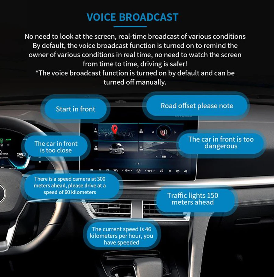 Нет необходимости смотреть на экран, в режиме реального времени транслировать различные условия. По умолчанию включена функция голосового вещания, чтобы напомнить владельцу о различных условиях в режиме реального времени. Не нужно время от времени смотреть экран, вождение безопаснее! Функция голосового вещания включена по умолчанию и может быть отключена вручную.