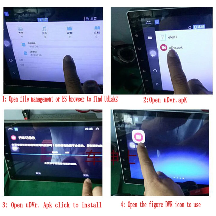 1. Пожалуйста, убедитесь, что ваш Автомобильный мультимедийный плеер Android 4,0 или выше2. Пожалуйста, выполните вышеуказанные действия для установки этой камеры. (Не используйте другое приложение DVR для работы с этой камерой. Вы должны установить приложение этой камеры,)3. Подключите эту камеру к USB вашего автомобильного мультимедийного плеера. (Если вы подключите эту камеру к неправильному USB. Например, USB проигрывателя не работает).