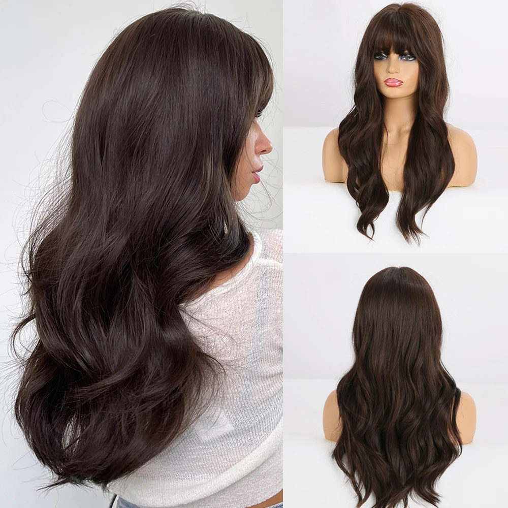 Длинные коричневые волнистые синтетические парики с челкой henmargu...