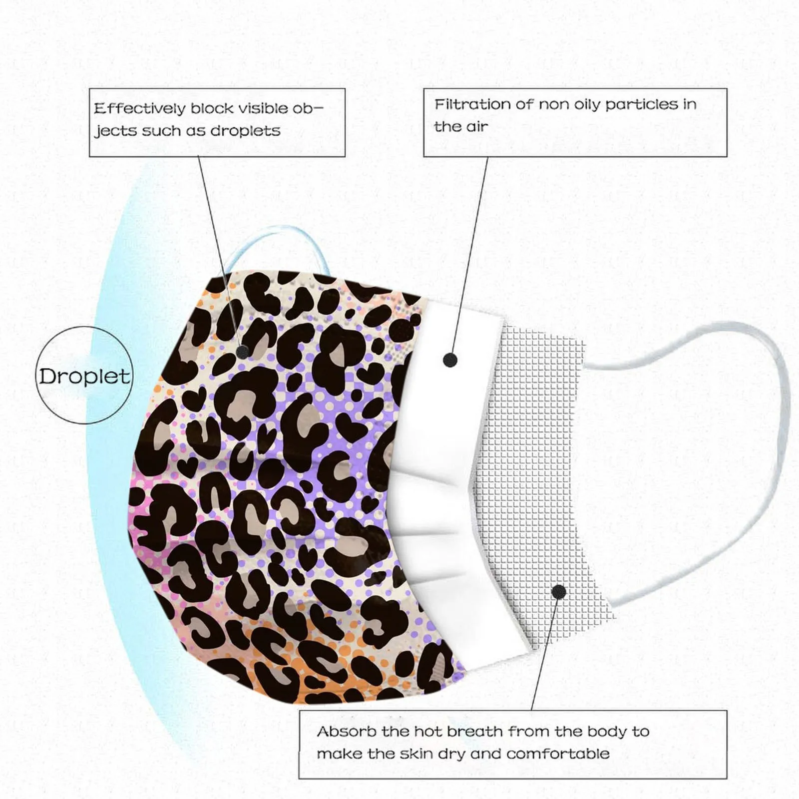 2. Дышащие материалы и милые узоры делают его практичным и модным. Специальный 1 слой спанлейс ткани + изготовленный аэродинамическим способом по технологии слой + слой из нетканого материала, конструкция обеспечивает защиту от пыли, автомобильный отходящий газ, пыльцу и т. д.