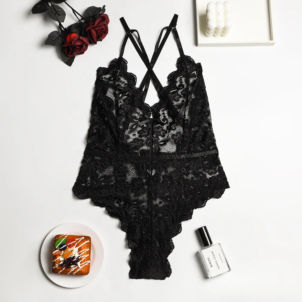 Сексуальное Кружевное боди, женское Прозрачное нижнее белье с V-образным вырезом и открытой спиной, Прозрачное нижнее белье, боди, черное Сетчатое нижнее белье, одежда